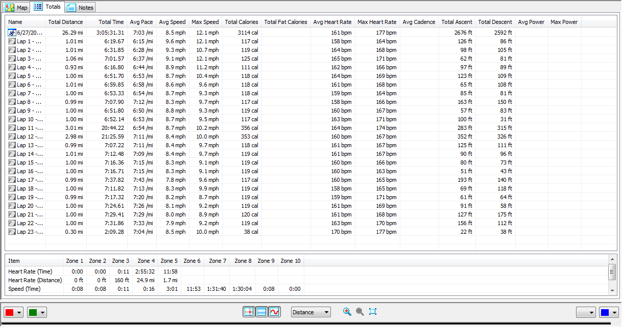 Run – 3:05:20 (7:04 per mile). I came out of the gates on fire on this run. I just went straight to my target HR (160 bpm), and nailed it. My first mile came in at 6:15, and then I gradually slowed down and settled into a pace in the high 6’s. I did the first 13.1 miles in 89 minutes, and I thought I had a shot at a sub 3 hour marathon, but in the end, I couldn’t quite pull it off. Below is a copy of my HR/pace file from the race.