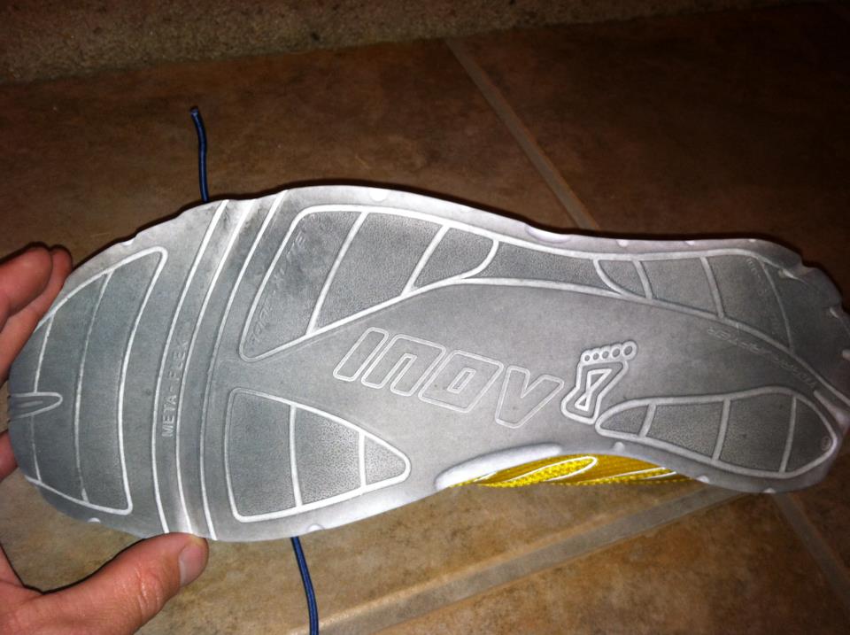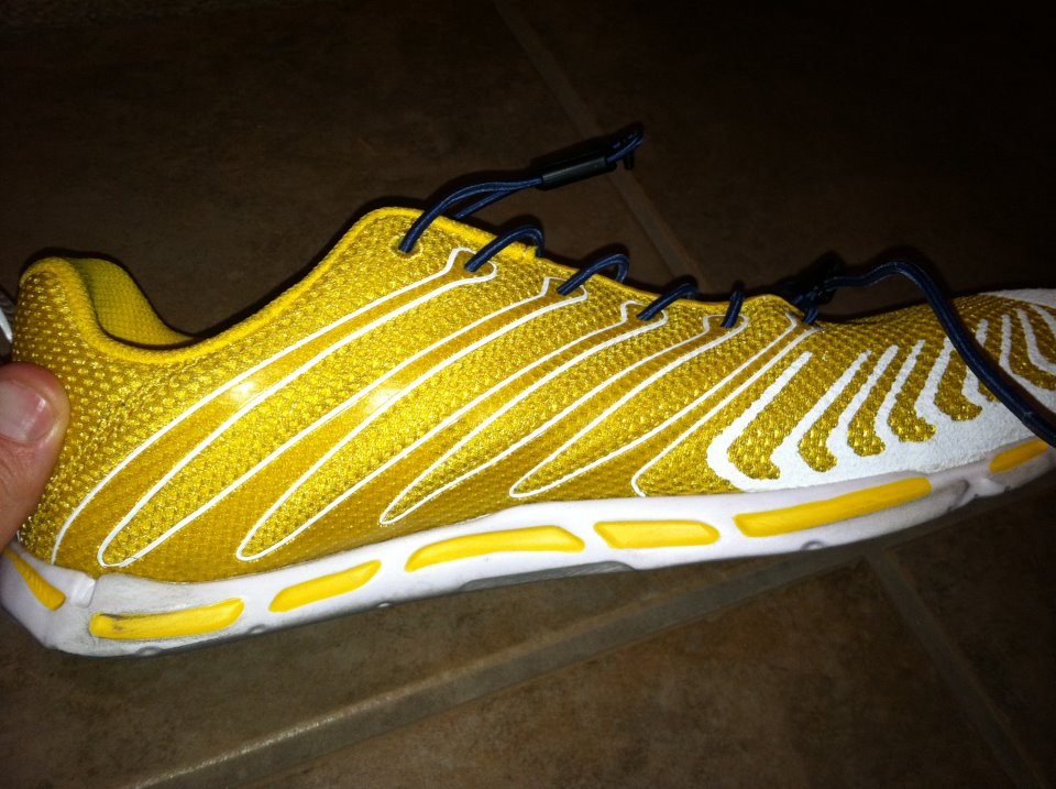 Some background – what I’m looking for in a shoe is something lightweight, with neutral support.  Simpler is better – I don’t want a lot of rubber between my foot and the road, because I believe that the human foot is a far better shock absorber than  anything a shoe company can manufacture.  I want a shoe that has enough rubber to protect my feet from rocks/glass/etc.., but not so much rubber that it interferes with my foot’s ability to function naturally.  Last year, I ran in the Puma Faas 250’s.  They were good, but I knew there had to be something even better and lighter out there.  I came across the Inov-8 Road X-Lite 155, and it looked like it met all of my requirements.  Light? Is 5.5 oz light enough for you? Check. Thin sole? 6 mm. Check. Neutral support? Check. Minimal heel/forefoot differential? 3mm. Check. Just looking at it, I knew it had the potential to be a very fast shoe.