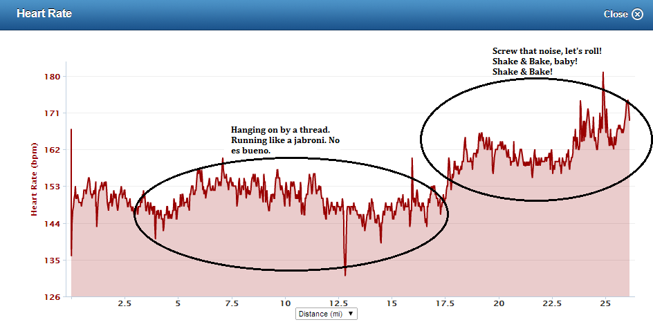 The task from Coach Tim was to take out the first two miles at 6:50 pace, and then build from there. I hit the first mile in 6:52 with low perceived exertion, but then had to take a bathroom stop at the beginning of mile 2. This cost me 90 seconds, and for some reason, seeing how the bathroom stop changed the “average pace” number on my watch really messed with my head. I instantly gave up on running sub-3, and didn’t get my head back on straight until mile 17. The heart rate file below pretty much says it all…